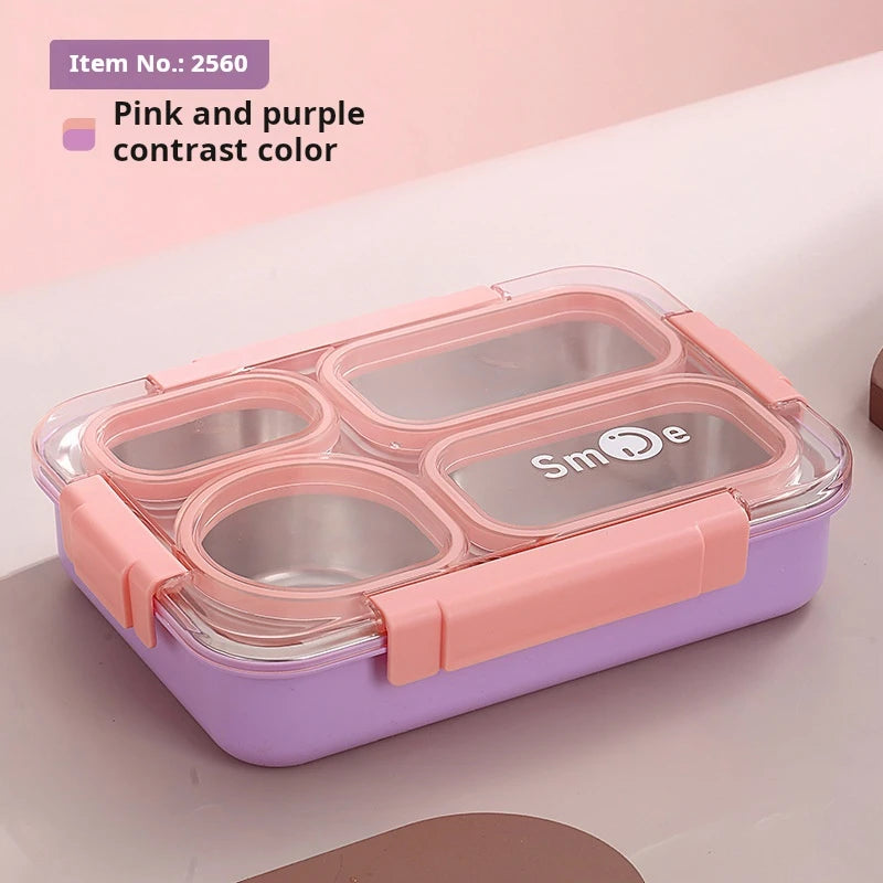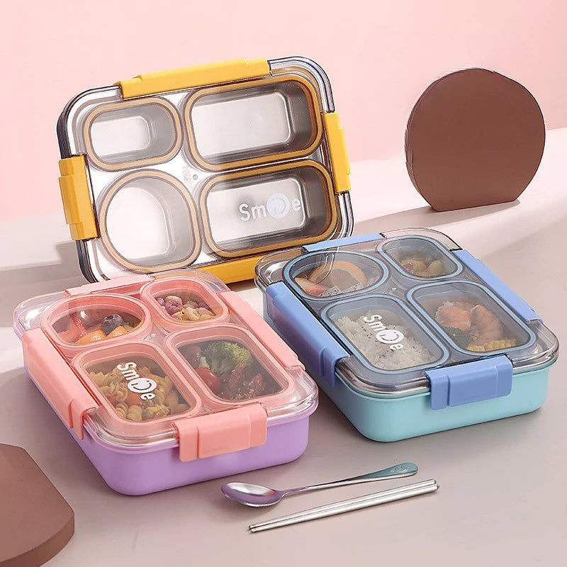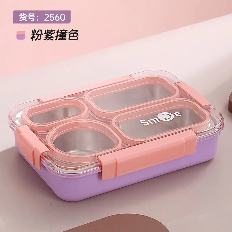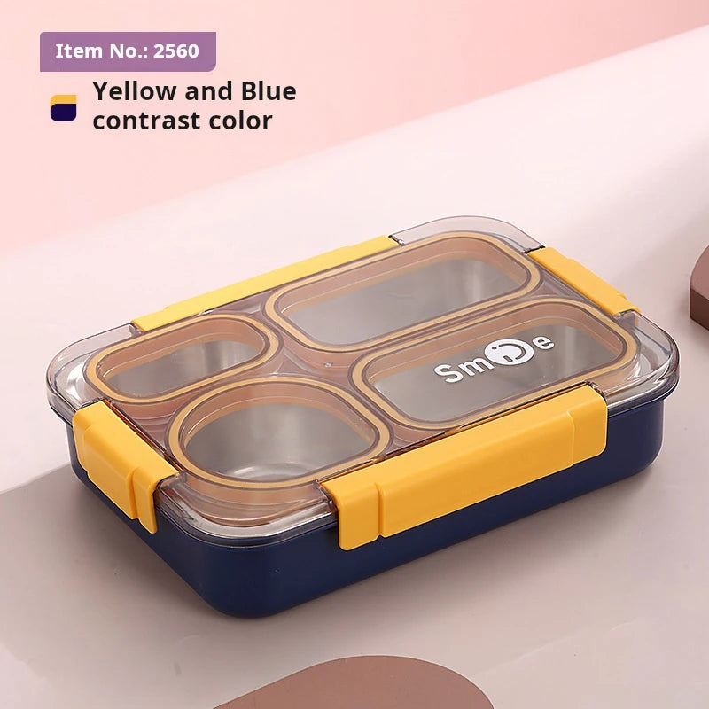 High quality Four grids Stainless steel sealed lunch box with bowl student office portable bento box with spoon chopsticks
